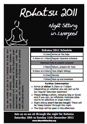 See the StoneWater events listing for details of a Rohatsu event I'm running in Liverpool. This will be a fairly traditional overnight meditation event, or night sitting (Jp: yaza). Click below for the flyer...
